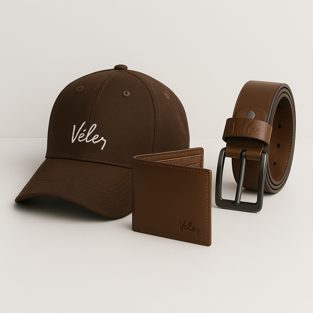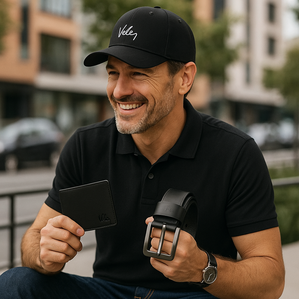 Confeccionado con cuero 100% genuino, su billetera y correa ofrecen resistencia, durabilidad y clase, mientras que su gorra ajustable unicolor se adapta a cualquier ocasión con un toque moderno y sofisticado.
